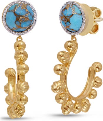 Turquoise stones with sparkly diamond halos suspend bead-textured hoop drops on these hand-polished earrings crafted from warm 14-karat gold vermeil.