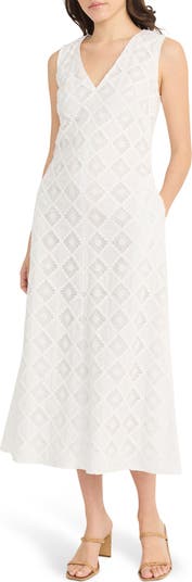 A dainty embroidered motif enhances the summery charm of this woven cotton dress.