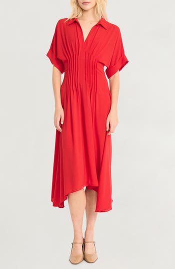 Pintuck pleats cinch the silhouette of a work-to-weekend dress finished with a flowy skirt and cut to a beloved and versatile midi length.
