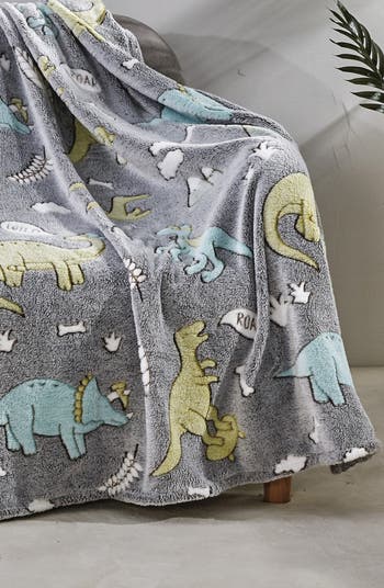 Bring fun style to your kid's room with this glow-in-the-dark dinosaur throw blanket made from soft plush fleece.