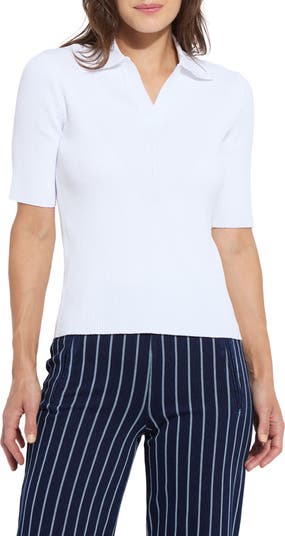 Elongated sleeves and a sporty johnny collar elevate this shape-hugging rib-knit polo.