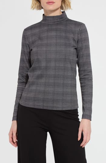 Made from printed, stretchy ponte material for structure and comfort, this mock-neck top features a sleek fit and hidden back-zip closure for ease.