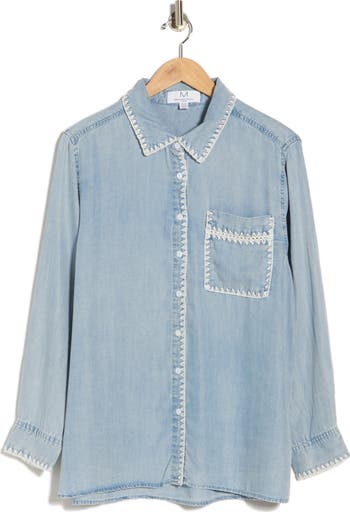 Contrasting triangular stitching traces the spread collar and placket of this Western-inspired shirt cut from lightweight denim.
