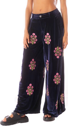 An embroidered floral pattern splashes beachy energy onto these velvety cover-up pants with breezy wide legs.