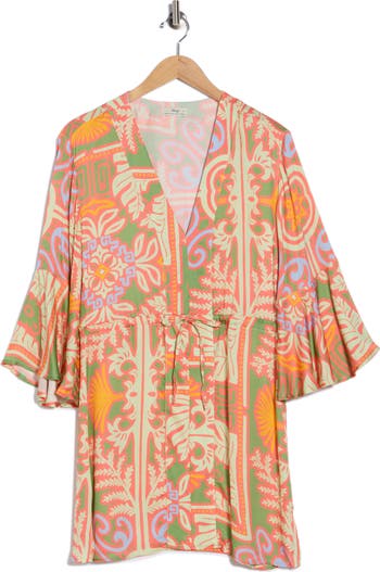 Stroll from beach to boardwalk in this lightweight cover-up caftan featuring a bold tropical print, ruffled bell sleeves and a drawstring-tie waist.