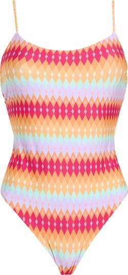 This one-piece swimsuit features moderate coverage and a colorful print for a flattering, confident look with standout appeal.