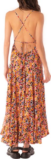 An open back with dainty straps gives breezy flair to this flowy cover-up dress that's secured by buttons down the front.
