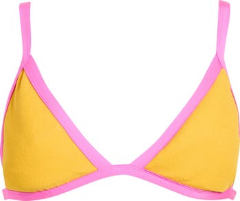 This reversible triangle bikini top features removable soft cups for customizable coverage and versatile styling.