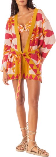 A bold tropical pattern enhances the beachy vibe of this cozy oversized cardigan knit from soft recycled cotton–blend yarns.