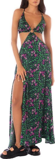 Bold cutouts and a daring open back further the breezy vibe of this stretch-kissed cover-up dress.