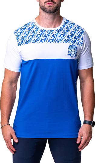 A logo graphic adorns the yoke of this stretchy cotton tee covered in bold colorblocking and finished with a signature lion over the heart.