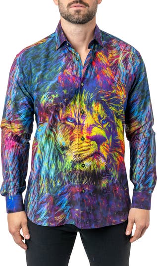 Make a fierce statement in an eye-catching lion-print shirt cut from luxe Egyptian cotton in a fit that's in between trim and regular.