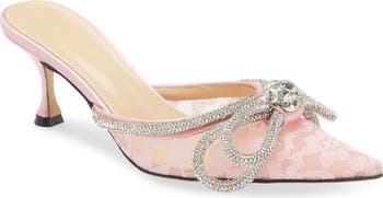 Crystals brilliantly sparkle around the brand's signature double bow as well as the topline of this lace pointy-toe mule perched atop a sculpted kitten heel.