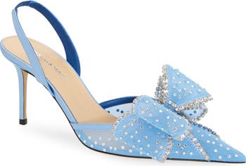 The sister design duo expands their effervescent collection of fantasy shoes with this pointy-toe slingback pump fashioned from crystal-studded mesh and decorated with lavish, gift-worthy bows.