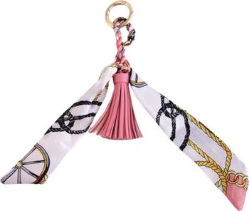 Add a personalized touch to your favorite bag with a clip-on charm that features a braided satin scarf and tassel.
