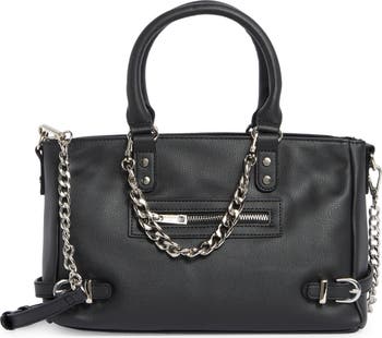 Removable chain straps and side buckles lend an edgy appearance to a satchel bag made from pebbled faux leather.