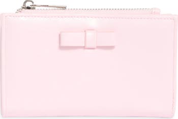 A pale-pink colorway sweetens the everyday vibe of a compact wallet made from smooth faux leather and touched up with light stitching along the perimeter.