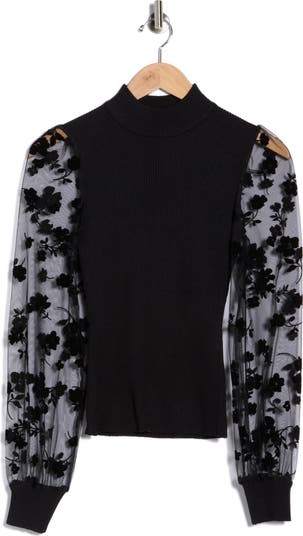 Elevate your date-night look with this ribbed mock-neck sweater framed by sheer sleeves with flocked flowers for romantic charm.