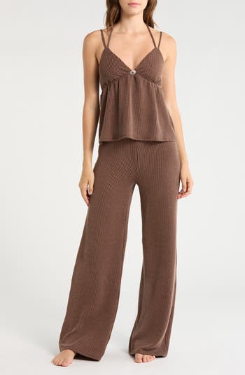 Contrast ribbing give dimension to a knit set that pairs a babydoll tank with full-length wide-leg pants for a look that's cute, casual and cozy.