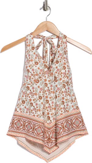 The halter-neck top features adjustable neck ties, a scarf‑inspired silhouette with a pointed hem and contrast border trim for a statement finish.