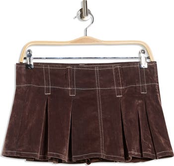 A pleated silhouette brings flirty style to this soft flocked denim miniskort fashioned with belt loops and interior shorts.