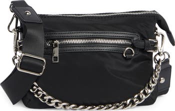 - Removable chain strap; removable, adjustable crossbody/backpack strap