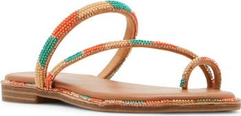 Vibrant beads animate the tubular straps atop a trendy sandal framed by a toe loop to secure each stride.