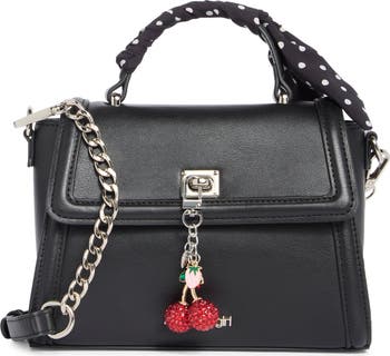 A scarf-wrapped handle and whimsical fruit charms elevate this compact bag fashioned from textured faux leather and outfitted with an optional shoulder strap.