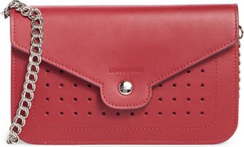 A perforated front panel and signature hardware elevate the aesthetic of a slim leather wallet on a chain. A well-organized interior and a polished chain crossbody strap offer effortless hands-free wear.
