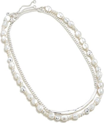 A stackable statement set of shiny necklaces features an eclectic mix of freshwater pearls and shiny silvertone-plated beads.