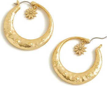 Starburst charms hang from the interior of these gleaming hoop earrings plated in goldtone with a hammered finish.