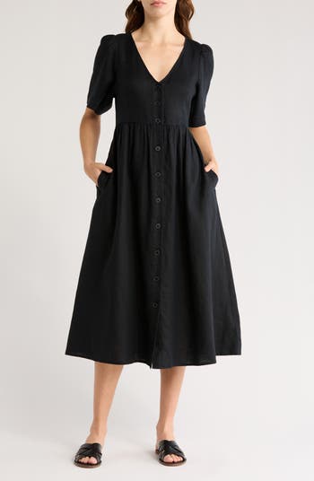 Effortlessly chic and easygoing, this linen button-front midi features a flattering V-neck and handy pockets.