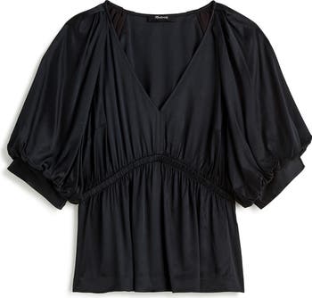 A deep V-neckline and elbow-length puff sleeves give this satin top a touch of modern romance. The shirring at the Empire waist adds just the right amount of detail for a flattering fit.