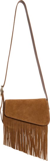 Fringed trim adds a fun flourish to a boho-inspired bag shaped from supple suede to elevate your everyday style.