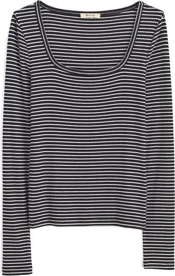 Coming in a striped rib knit, this top is designed with a square neckline and elongated sleeves. Fitted and fabulous, it's a layering essential that can stand alone too.