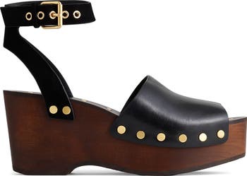 A classic yet edgy leather clog features an open toe and a chunky platform wedge crafted from real wood. Finishing touches include metal studs and an adjustable ankle strap adorned with grommets.