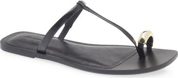 High-polish hardware capping the toe loop brings a sculptural element to this leather slide sandal bisected with a slender T-strap.
