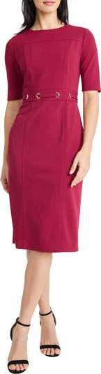 Exude perfectly polished style in this elbow-sleeve sheath dress framed by elegant princess seams and laced metallic grommets at the waist.