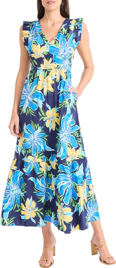 Easily go from the farmers' market to weekend brunch in this midi-length dress covered in blooms and styled with ruffled shoulders.
