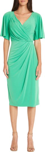 Fluttery sleeves frame an elegantly draped sheath dress for charming style.