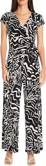 A waist tie defines the silhouette of a straight-leg jumpsuit complete with a bold pattern for eye-catching appeal.