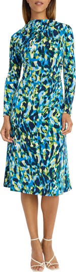 An elegant funnel neckline frames this boldly patterned dress designed in a curve-hugging draped silhouette with long sleeves.