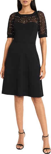Pearly studs add a delicate touch to the semi-sheer chiffon yoke and gathered puff sleeves of this elegant fit-and-flare dress.