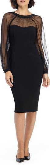 Sheer mesh is softly gathered to a V-back neckline for a vintage-inspired start to a lithe crepe sheath streamlined by princess seams.