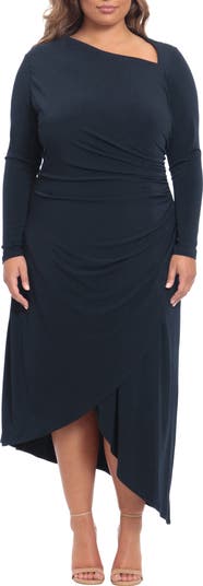 A long-sleeve midi dress crafted from a soft stretch knit flatters with an asymmetric neckline, side ruching and an artfully angled hem.