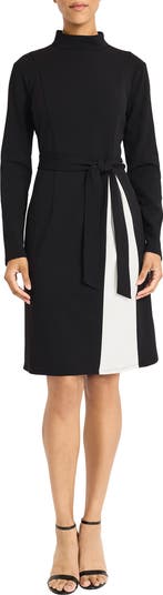 A contrast panel enhances the circle skirt of this sophisticated dress, complete with long sleeves and a turtleneck collar—perfect for transitioning between seasons.