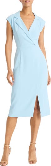 Handsome notched lapels further the blazer-inspired styling of this midi sheath cut from stretch-enhanced fabric.