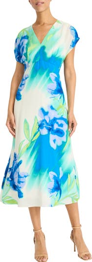 A vibrant print washes over this midi-length dress topped with an extended shoulder neckline.