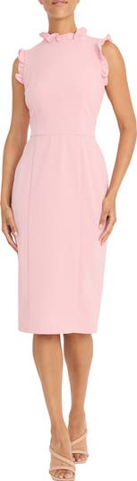 Ruffled trim brings feminine style to this chic midi length sheath dress that's perfect for date night.