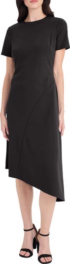An asymmetric hem enhances the desk-to-dinner appeal of a short-sleeve sheath dress cut from a stretchy knit.